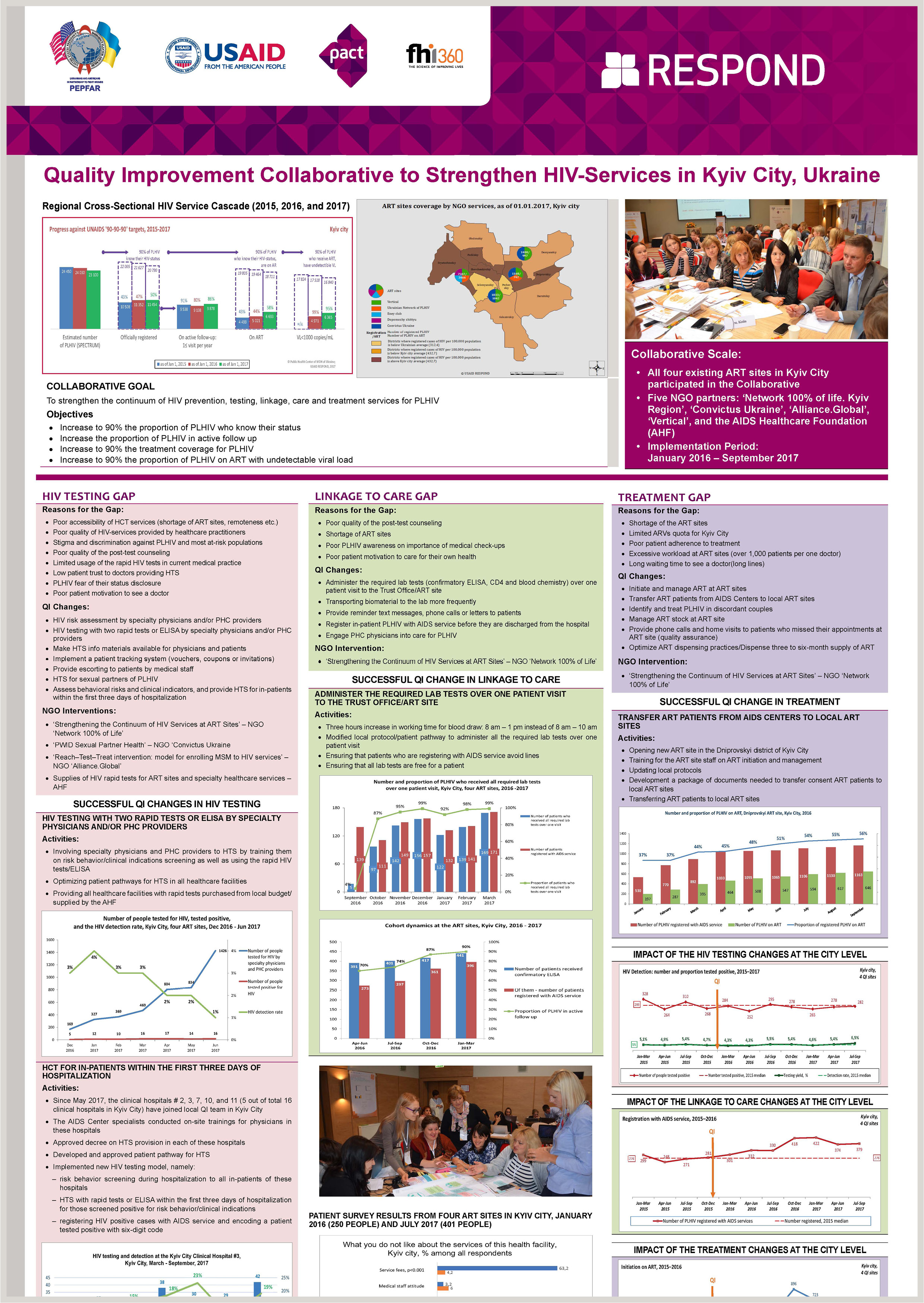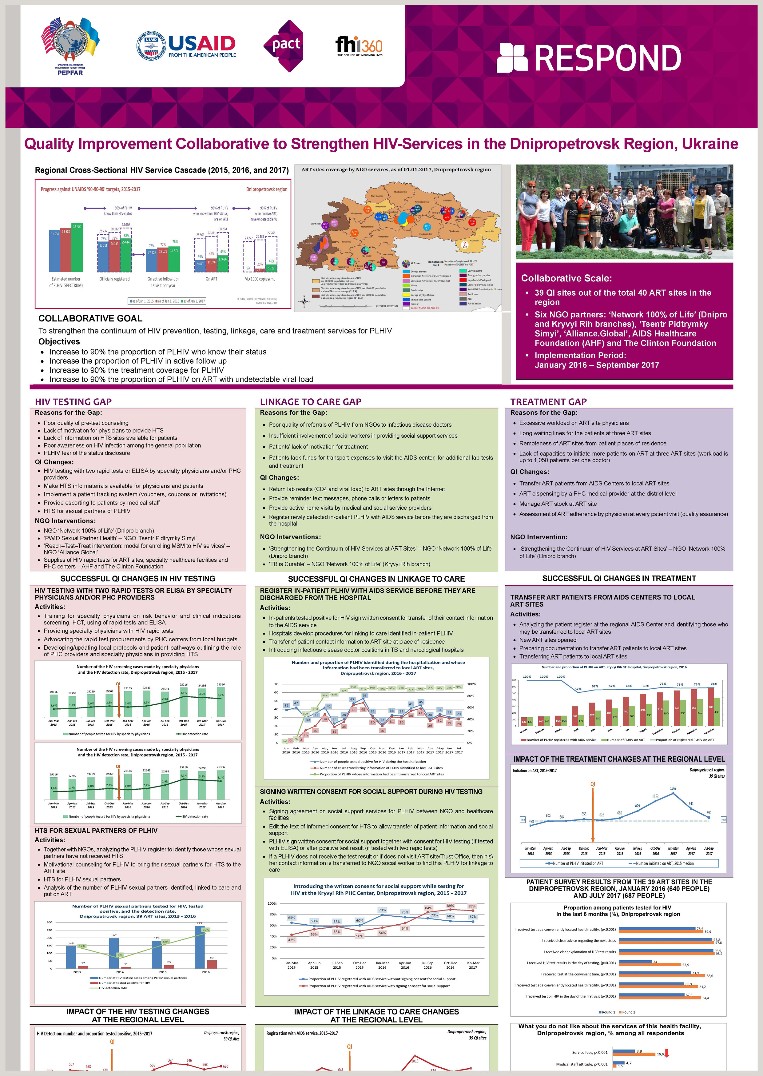 This compilation presents QI success stories from the USAID RESPOND Project improving HIV services in eight pilot regions of Ukraine: Dnipropetrovsk, Zaporizhzhya, Kyiv, Kirovograd, Mykolaiv, Odesa, Kherson and Kyiv City. Successful QI Changes are illustrated by region-specific process indicators demonstrating a positive trend or excess over a baseline median measured before implementation. Each process indicator also represents a contribution to the higher-level outcome indicator related to the corresponding gap in the HIV service cascade. |