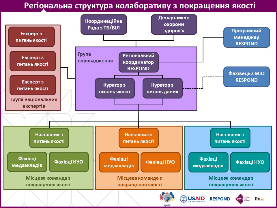 Регіональні групи впровадження проекту з покращення якості (РГВ) надають технічну допомогу відповідним місцевим командам з покращення якості. До складу РГВ входять регіональний координатор, один чи більше кураторів з покращення якості, та один чи два кураторів з якості даних залежно від розміру регіону та кількості АРТ-сайтів. РГВ інформують місцеві органи влади (департаменти охорони здоров’я та ради з питань ВІЛ/ТБ) про хід роботи та забезпечують їхню підтримку діяльності колаборативу. РГВ отримують підтримку з боку національних експертів з покращення якості та співробітників Проекту RESPOND.